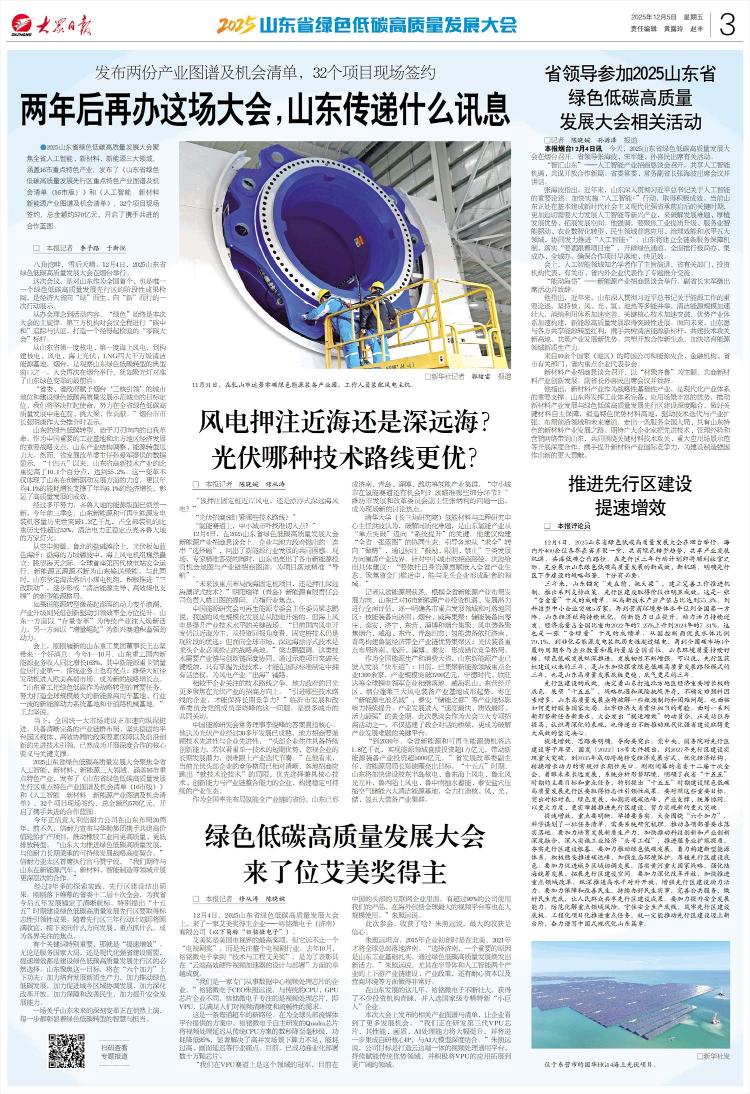 □ 新华社记者郭旭雷报道,11月21日,在乳山市远景零碳绿色能源装备产业园,工作人员正在组装主体风力发电机。扫描二维码查看专题报道 ● 2025年山东省绿色低碳高质量发展大会聚焦全省人工智能、新材料、新能源三大领域,覆盖16市产业主要特色。发布《山东省绿色低碳高质量发展先行区重点特色地图及机遇清单(16市版)》和《人工智能、新材料、新能源产业地图及机遇清单》。现场已签约32个项目,总价值约570亿元,开启联动开发大计□记者李自录于新月八角湾畔,雪后天晴。 12月4日,2025上海世博会安东省绿色低碳高质量发展大会在烟台召开。此次会议是对山东作为全国第一个也是唯一一个绿色低碳高质量先行发展区取得的阶段性成果的回顾。这是一个经济大省崛起走向“绿色”、“新”的行动体现。从会议的举办理念到活动内容,“绿色”始终是本次会议的主旋律。第三方机构对会议全程进行“碳中和”监测认证,打造经得起考验的“零碳会议”标杆。从山东第一代核电省和风力发电远离核电、风电、海上光伏、液化天然气等四大千万级清洁能源基地,烟台是观察山东绿色低碳转型的典型窗口之一。的c大会再次在烟台召开,聚焦山东绿色转型前沿。 “省委、省政府赋予烟台‘三核引领’城市地位和建设绿色低碳高品质示范城市的目标。”烟台市市长张明康在推介会上表示,绿色低碳转型从自身内部革命开始。山东作为我国重要的工业基地和北方地区经济发展的重要战略支点,面临着产业结构调整和能源转型的巨大压力。省发改委主任艾军表示,“十四五”以来,山东省高新技术产业比重提升了10.1个百分点,达到55.2%,这一变化不仅体现了山东创新发展的实力。发展的同时,也支撑了年均6.1%的经济增长和年均4.1%的能源消费增长,展现了高质量发展的成效。经过多年努力,齐鲁能源已焕然一新。今年前三季度,新能源和可再生能源发电装机历史性突破1.3亿千瓦,占总装机容量的53%以上。清洁能源继续照亮齐鲁的数千户家庭。从空中看,鲁北盐碱滩涂上的光伏板就像一片蓝色海洋;海上风力发电机雄伟地矗立在渤海碧波浩瀚之中;望海望天,首座四代核电站安全运行,新能源不断为山东带来绿色能源。与此同时,山东决心淘汰落后小燃煤企业山东省电力单位积极推进“三联动改革”,将逐步形成“以多种清洁能源为主导,以高效煤电为支撑”的新能源格局。如果说能源转型引发了电力转型变革浪潮,那么产业升级则通过动力转换带动了整体效率的提升。山东一方面以“股改”为传统产业注入新活力,另一方面以“增量”为新兴赛道积蓄强劲动力。新上任的山东重工集团董事长带来了好消息:今年1-10月,山东重工国内新能源业务同比增长163%,新能源重卡销量稳居行业第一,传统业务也有亮点,中径发动机在欧美高端市场也有亮眼表现。并成为新的战略增长点。 “山东重工以绿色低碳为战略转型的主要任务,着力打造全球最大的新商用能源汽车基地,引领新型动力系统基地和非基础机械行业。”王志坚说道。当前,全国统一市场建设正在深入加快。清晰完整的产业群布局、扎实稳定的平台园区载体、高效协同的政策要素保障、前沿创新和先进技术引领成为深度合作的主要本质和主要支撑。 2025年山东省绿色低碳高质量发展大会已聚焦全省人工智能、新材料、新能源三大领域,覆盖16市行业主要特点。发布了《重点领域地图和机会清单》山东省特色产业绿色低碳高质先行开发区(16个市级版)》和《人工智能、新材料、新能源产业地图及机遇清单》,现场签约32个项目,总价值约570亿元,开启合作大计,共同前行。今年是意大利倍耐力公司在山东成立20周年。不久前,倍耐力宣布将携手山东省绿色低碳优质先行开发区。华勤集团发展高附加值轮胎,推动橡胶产业向更高品质、更低排放转型“山东大力推动绿色低碳、高质量发展,非常符合倍耐力的长期发展战略。”倍耐力首席执行官马赞宁表示,“我们期待与山东在新能源汽车、新材料、智能制造等领域开展更深入的合作。”i 亚太地区。取得了丰硕的成果。省委十二届十次全会为我省未来五年的发展挂上了明确的航标,明确提出“十五五”期间绿色低碳高质量发展试验区建设要取得一流成果。虽然先行区三年行动计划即将圆满结束,但发展向什么方向、重点发展什么,将成为各界关注的焦点。有一个关键词特别重要,那就是“提速增效”。无论是服务国家大局,还是建设现代化强省,提速增效是建设绿色低碳高质量先行发展区的必然选择。围绕这一目标,山东将抓好“六个提升”:强化着力培育发展新生产力,着力推动绿色低碳发展,着力促进城乡协调发展,着力深化改革开放,着力保障和改善民生,着力加强安全保障。发展能力。一场事关山东未来的深刻变革正在悄然发生,每一步都彰显着绿色低碳转型的智慧和责任。