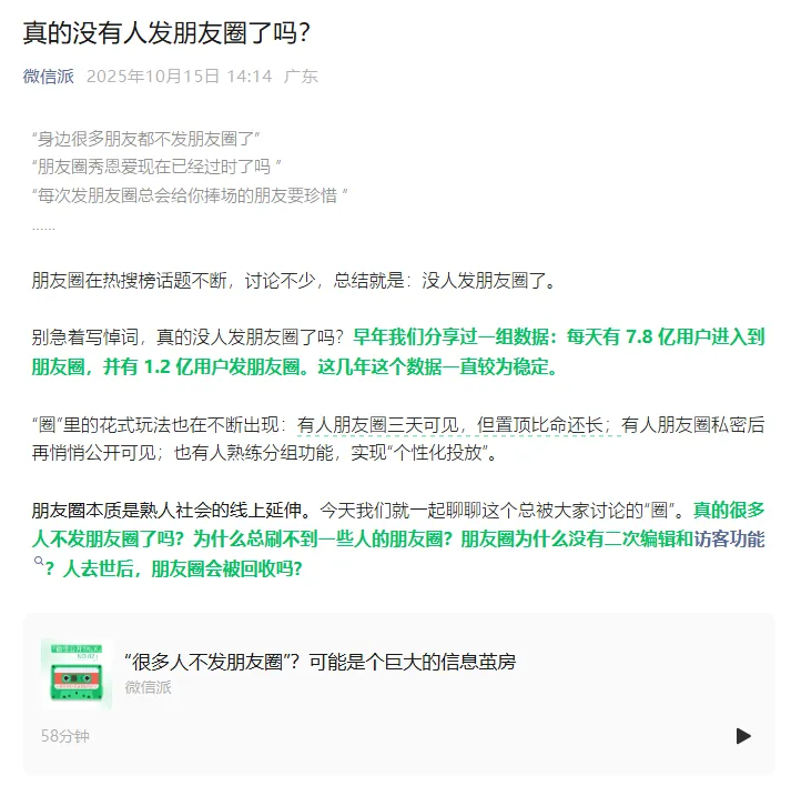 10月15日,针对此前设置朋友圈的相关话题,微信公众号发布了一篇《真的没人发朋友圈吗?》的文章。 “ 回复。文章透露,微信早年分享了一组数据:每天有7.8亿用户进入朋友圈,1.2亿用户发布朋友圈;这个数据多年来一直比较稳定。与此同时,微信公关总监也回应微信拍的播客评论称“很多人不再发朋友圈了,朋友圈真的很酷吗?”他说这是一种个人感觉,就像一个信息茧。关于微信朋友圈功能的讨论由来已久。在社交媒体上,有网友讨论希望在朋友圈增加“阅读展示”、“访客记录”等功能。当时,腾讯方面否认了这一传闻。此时,微信公关总监也表示,微信朋友圈不会有嘉宾功能。 “微信不想在产品逻辑上给大家增加更多的社会压力。”他还表示,朋友圈不太可能有第二个功能——编辑。 “朋友圈记录了一个人的历史,没有办法回去改变一个人的生活,所以人们很难与自己的叙述发生性关系。” (封面故事)