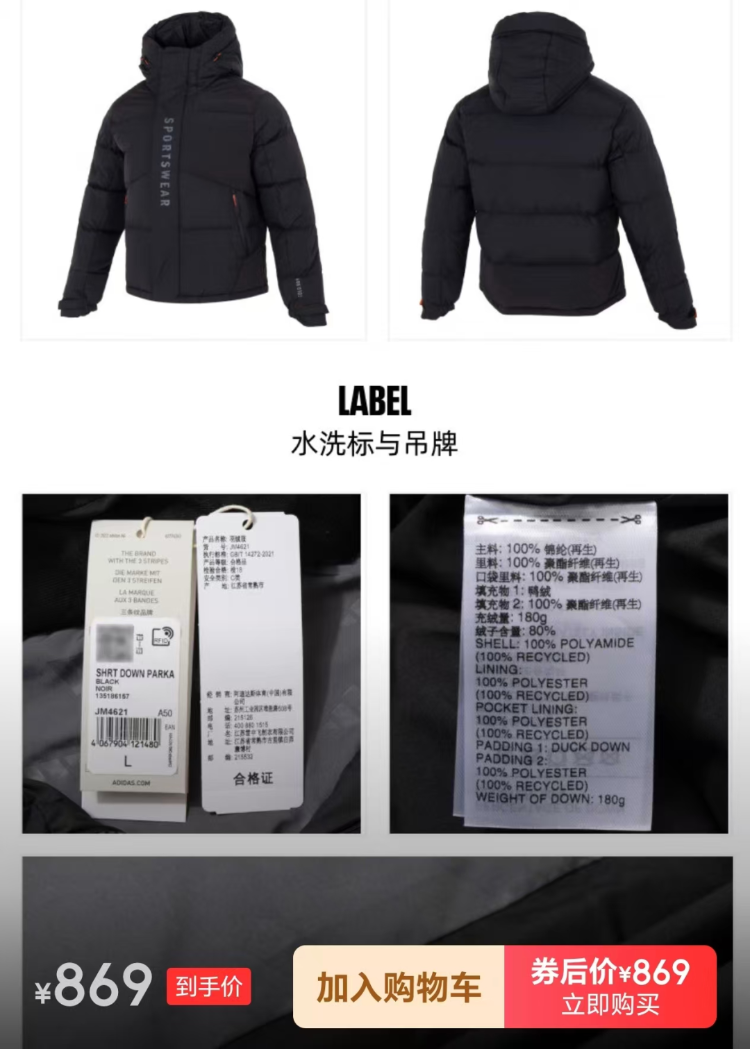 日前,有网友在社交平台发帖称,自己在短视频平台直播间购买的阿迪达斯羽绒服,竟是薛中飞代工产品。据经济视界直播报道,10月20日,记者就此事致电阿迪达斯服务热线。该工作人员表示,店内不知道具体产品是否贴牌以及贴牌信息。所有商品均从仓库直接发货,以实际发货为准。不过,客服表示,所售产品都是有质量保证的。对于品牌溢价问题,该工作人员表示无法回应。 10月21日,界面新闻发现,阿迪达斯京东旗舰店运营的部分品牌羽绒服竟被薛中飞刺伤。其中,一款运动短款羽绒服售价869元,贴有薛中飞贴牌标签。本品含鸭绒135克,带绒含量高达80%,并配备核心加热技术。综合经济电视直播、界面新闻