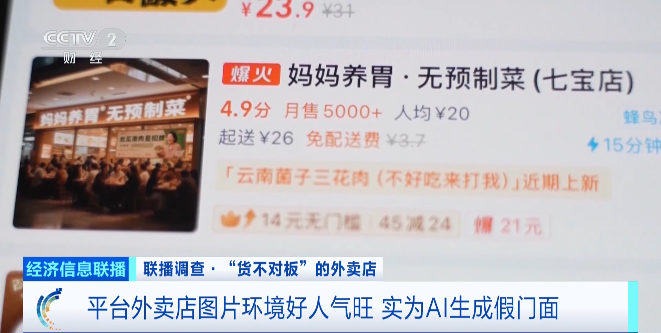 。很多消费者都经历过外卖平台上的餐厅照片和线下门店的商品“乱七八糟”的情况。所谓的看似烟火气十足的“真人照片”,实际上是外卖商家利用AI技术生成的假照片。 “月销量5000单,评分4.9,无初始菜品。”在外卖平台上,记者看到了一家名为“妈妈养味”的外卖店。其主页图片显示,这家店有一个眼睛标志,里面挤满了食客。点击这里后,还有一段展示厨房和店内外环境的视频。当记者按照平台显示的地址来到上海市闵行区七莘路华商时代广场时,并未找到标有5130号的沿街商铺。据说,当年路过的外卖记者发现,“妈妈苏力鲜提燕”这家店并不在一楼,而是在二楼的一个走廊深处。记者看到,在狭窄的巷子里,厨房门的一侧贴着“妈妈养胃”的红色牌子,另一侧贴着“鲜三辣”的牌子。店里只做外卖,没有堂食空间。气氛也和平台上“杨威妈妈”、“鲜三辣”店的图片不同。原来,这家厨房在平台上经营着“妈妈养味”和“鲜三辣”两家店。营业地址和牌照不同,每家店月销售额超过4000单。这并非个别案例,实际产品与图片不符。一家名为“清河小厨”的外卖店。虽然照片显示该店门面装修精美,但记者在现场发现,该店与几家专营外卖的店铺一起隐藏在黄浦区一栋大楼二楼的一个隔间里。不仅没有明显的门牌号,连走廊都里面还装满了食材和生活用品。此外,一些营销人员通过品牌介绍和视频来吸引消费者。在一家名为“上海成都人”的外卖店里,文字介绍中看似就餐环境不错,但实际情况是该店与其他外卖店共用一个用餐区,而且地上的烟头也没有人清理。记者调查发现,由于人工智能生成门面成本低廉,成为一些商家打造“虚拟门面”的“捷径”。在很多平台上,“AI生成店铺照片”的服务费显示为几十元。商家表示,他们只需要提供店铺名称,即可利用店铺名称虚拟场景定制形象。通过在AI软件中输入“餐厅店面”、“烟花”等关键词,零成本秒级生成一张精美的店面地图。