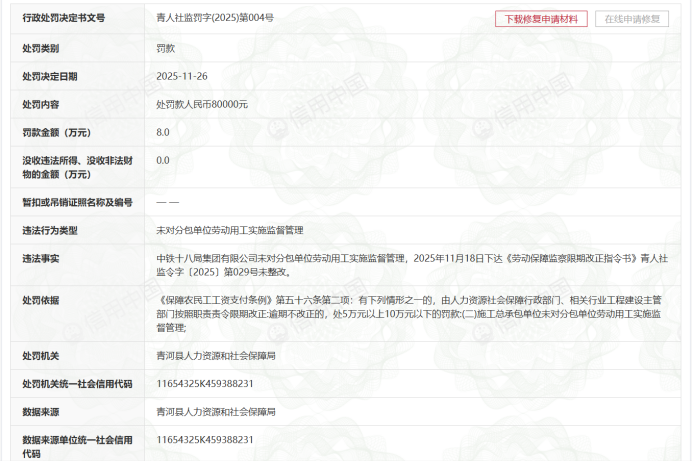 海报新闻记者孙来宾报道 近日,信用中国、信用能源网相继发布对中铁十八局集团有限公司及其子公司(中铁十八局集团隧道有限公司)行政处罚信息,引起社会广泛关注。据信用中国网站公告,中铁十八局集团有限公司收到清人社会监督处罚字(2025)号决定书显示,处罚类别为罚款,处罚金额为8万元,处罚决定日期为11月26日。违法事实一栏显示,该公司未能对分包单位的作业生产进行监督管理。 11月18日烧录的《教保治安坚守教改》清人社监令字[2025]029号未修复,故予以处罚。与此同时,Credit Energy网站也发布了信息中铁十八局集团隧道工程有限公司因在申领新的电力安装、试验许可证时,骗取申请人劳动合同和技术总监聘任试验等方式取得许可证,被华中能源监管局给予警告并处以2万元罚款。处罚日期为11月25日。