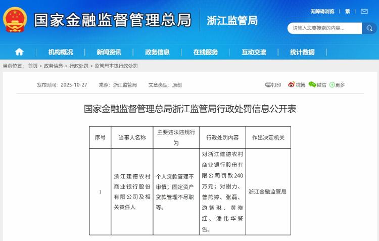 海报新闻记者赵恩报道,10月27日,国家金融监管总局浙江监管局出具的行政处罚公开表显示,浙江建德农村商业银行股份有限公司因个人贷款管理不当、未调整走线照明等问题,被浙江省金融监管局罚款240万元;对相关责任人谢力、曾彦廷、张雷、尤子林、黄晓红、潘卫华给予警告处分。资料来源:国家金融监管局浙江监管局。海报新闻记者(记者微信ID:Haibaonewssw)注意到,本月该银行被扣费超过800万元。 10月17日,中国人民银行浙江省分行发布关于非行政处罚问题的信息公告。浙江建德农村商业银行股份有限公司被浙江省工商局警告并罚款579.5万元中国人民银行的分支机构。银行的主要违法行为包括违反金融统计管理规定;违反账户管理规定;违反商户管理规定的;违反防伪经营管理规定的;使用财政存款或资金;违反信用信息采集、提供、查询及相关管理规定的;未按规定履行客户身份识别义务;未按照要求保存客户身份信息和交易记录;未按照要求提交大额交易报告或者可疑交易报告的; Mra 与身份不明的客户进行交易。资料来源:中国人民银行浙江省分行行政处罚决定信息公示表(浙刑罚字[2025]号)时任计划财务部总经理吴某被罚款27500元;黄某任计划财务部副总经理零售金融部罚款1万元;时任零售财务部文员于某被罚款1万元;工商管理科科员罗某罚款5.5万元;大研支行客户经理舒某被罚款5.5万元。天眼查官网显示,浙江建德农村商业银行股份有限公司成立于1993年,位于浙江省杭州市。它是一家主要从事金融和金融服务的企业。公司注册资本4.23亿元,法定代表人王金芳。